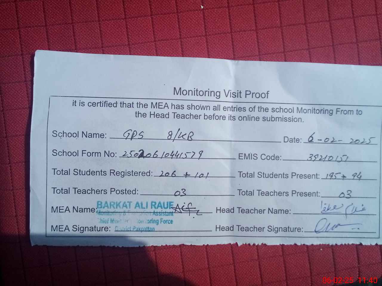| Attendance Register | Head Teacher | MEA with School | Visit Proof |