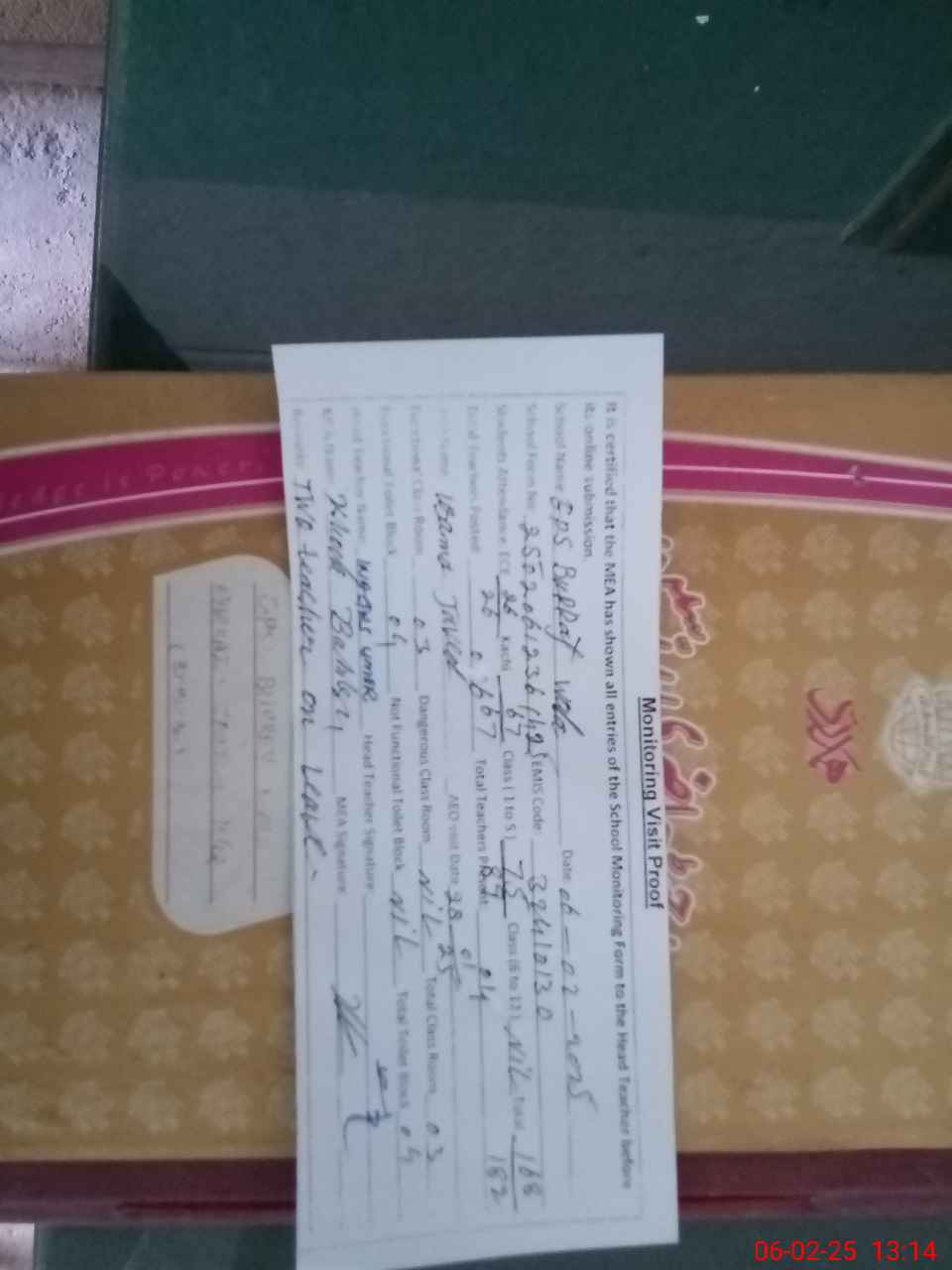 | Attendance Register | Head Teacher | MEA with School | Visit Proof |
