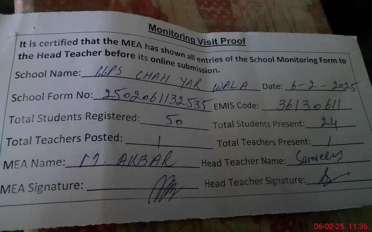 | EMIS Code: 36130611 | Name of School: GGPS CHAH YAR WALA | |||