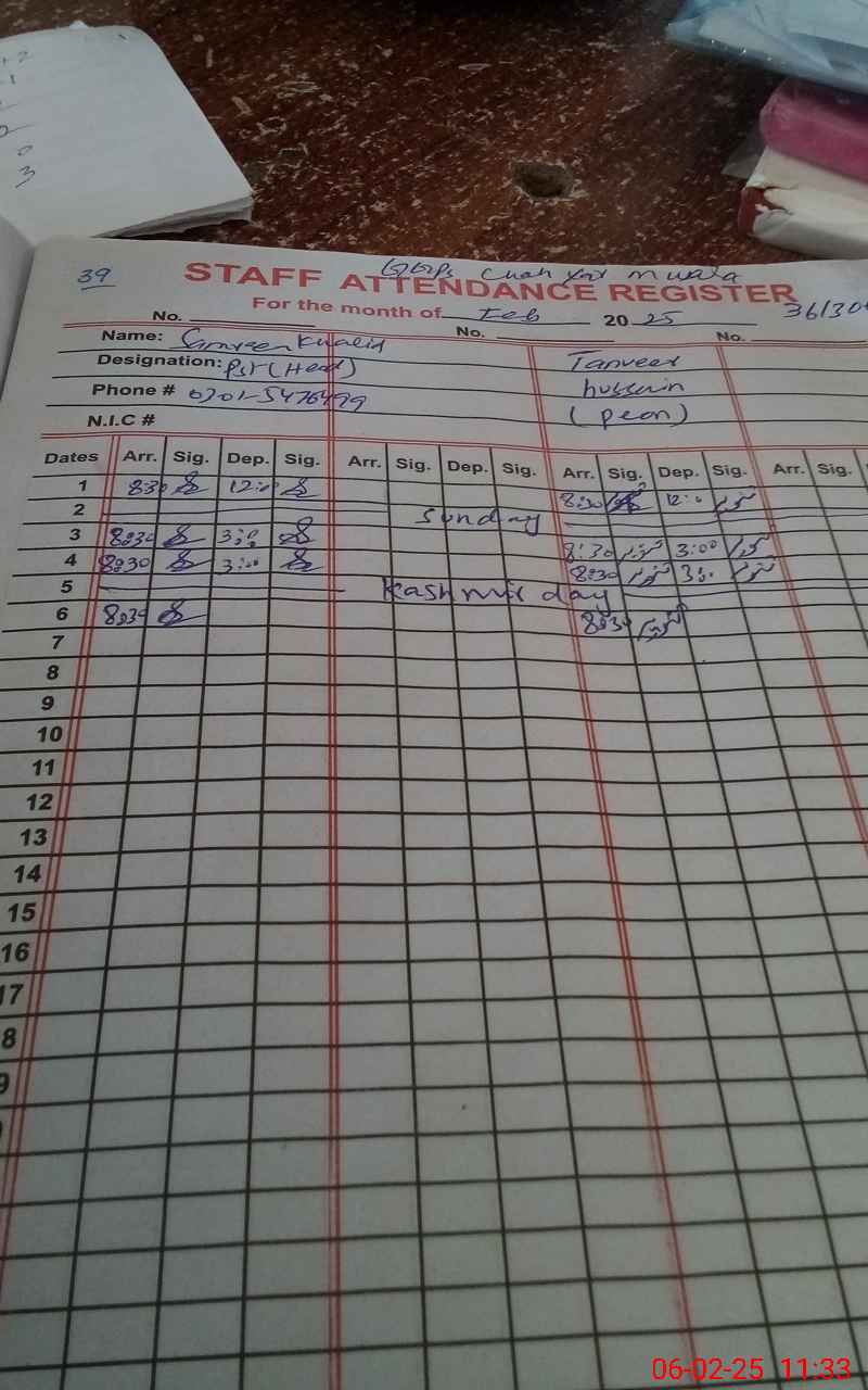 | CNIC | Full Name | Designation | R/C | Absence During Last Calender Month |