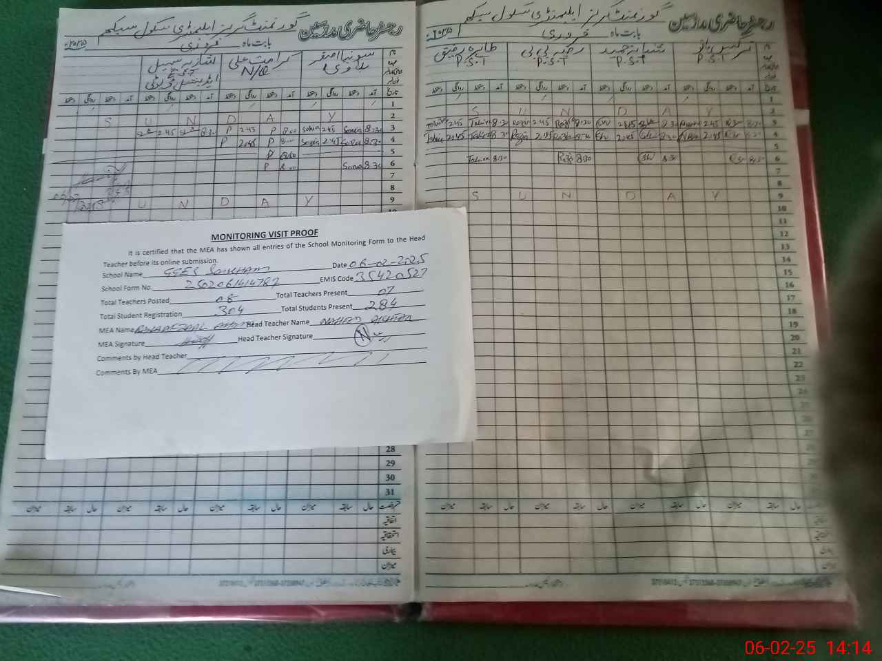 | Attendance Register | Head Teacher | MEA with School | Visit Proof |