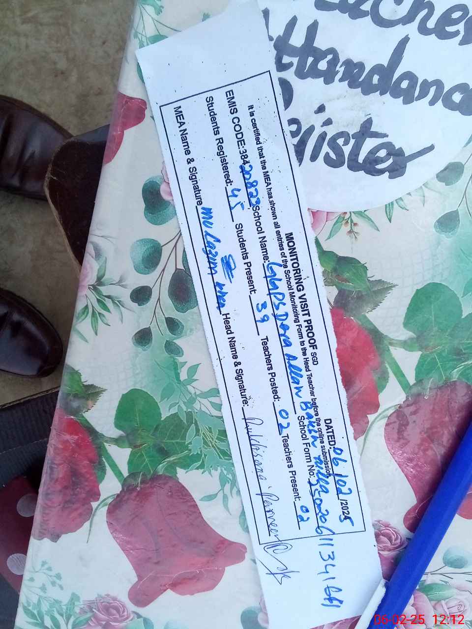 | Attendance Register | Head Teacher | MEA with School | Visit Proof |