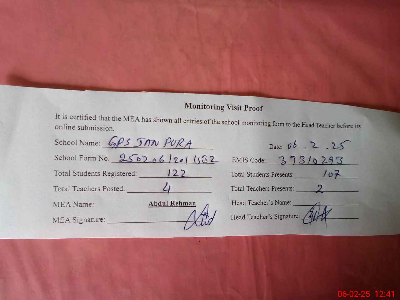 | Attendance Register | Head Teacher | MEA with School | Visit Proof |