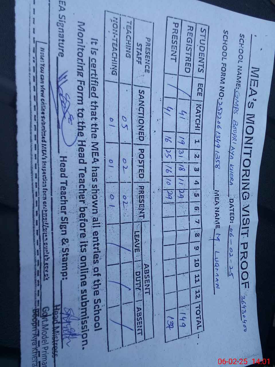 | Certified that this School was Inspected by the Undersigned MEA/DMO Today and the Information Stated Above is as Per Record. | |||||