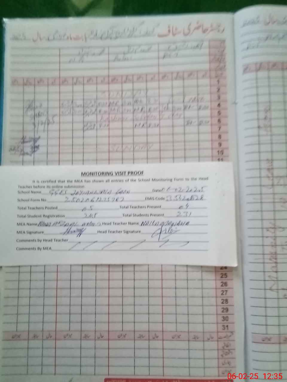 | Attendance Register | Head Teacher | MEA with School | Visit Proof |