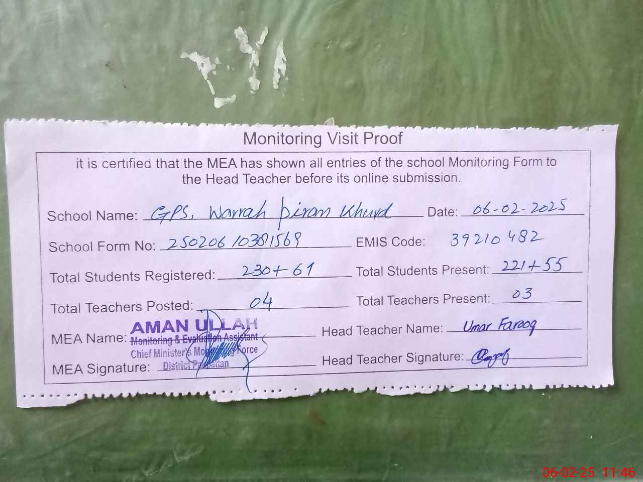 | EMIS Code: 39210482 | Name of School: GPS WARRAH PIRAN KHURD | |||