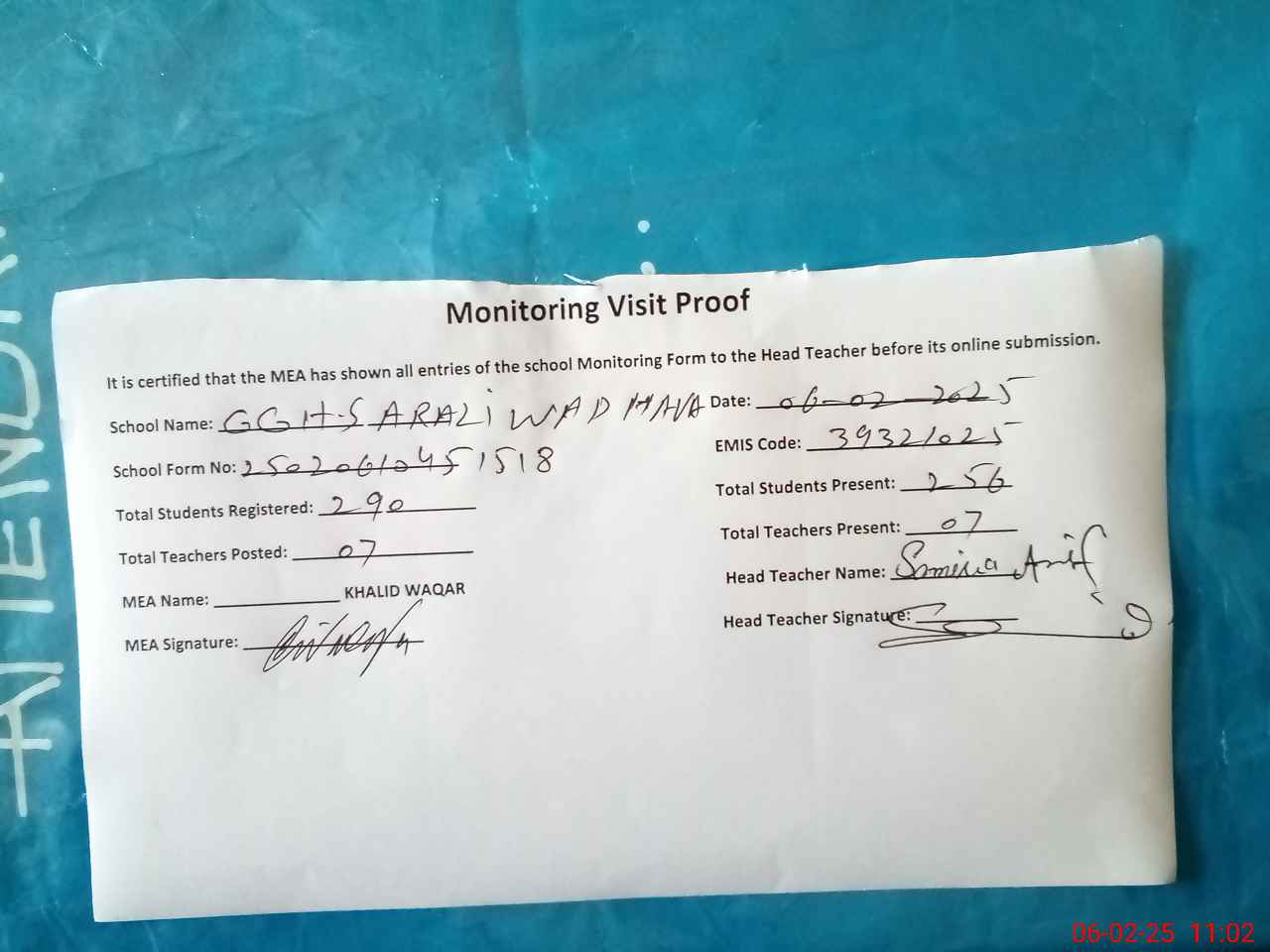 | Attendance Register | Head Teacher | MEA with School | Visit Proof |