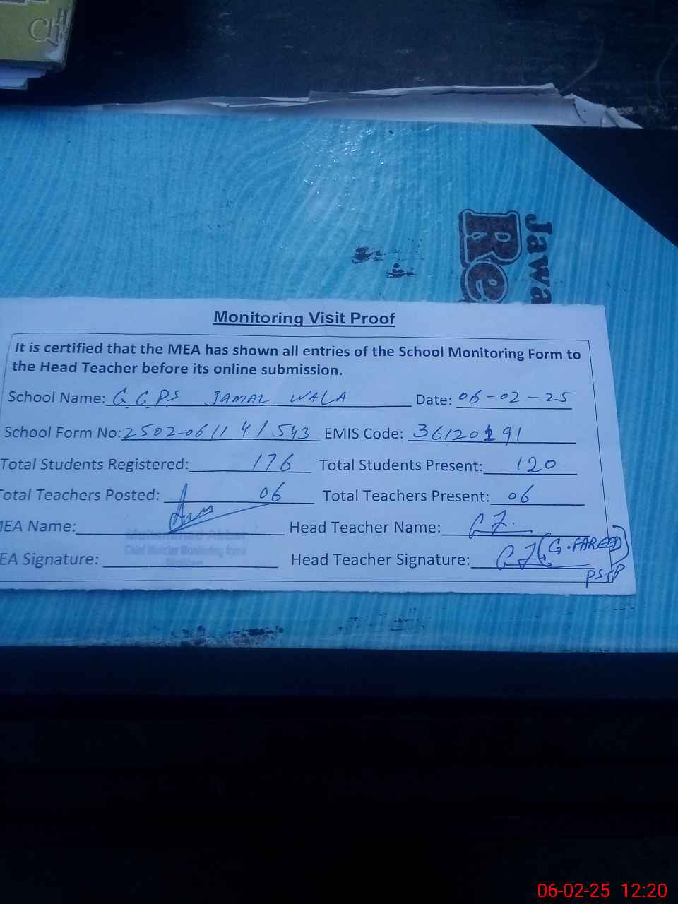 | Attendance Register | Head Teacher | MEA with School | Visit Proof |