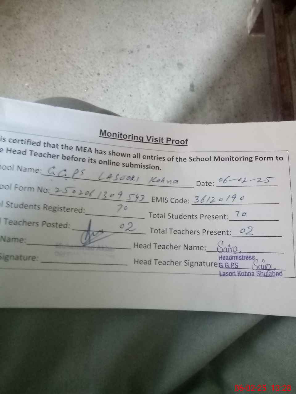 | Attendance Register | Head Teacher | MEA with School | Visit Proof |