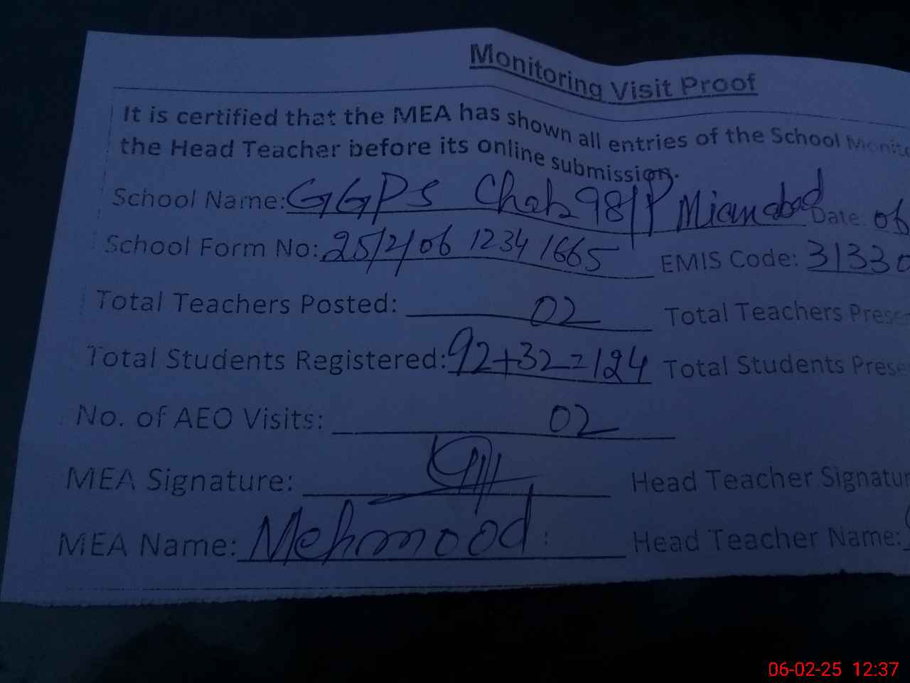 | Attendance Register | Head Teacher | MEA with School | Visit Proof |