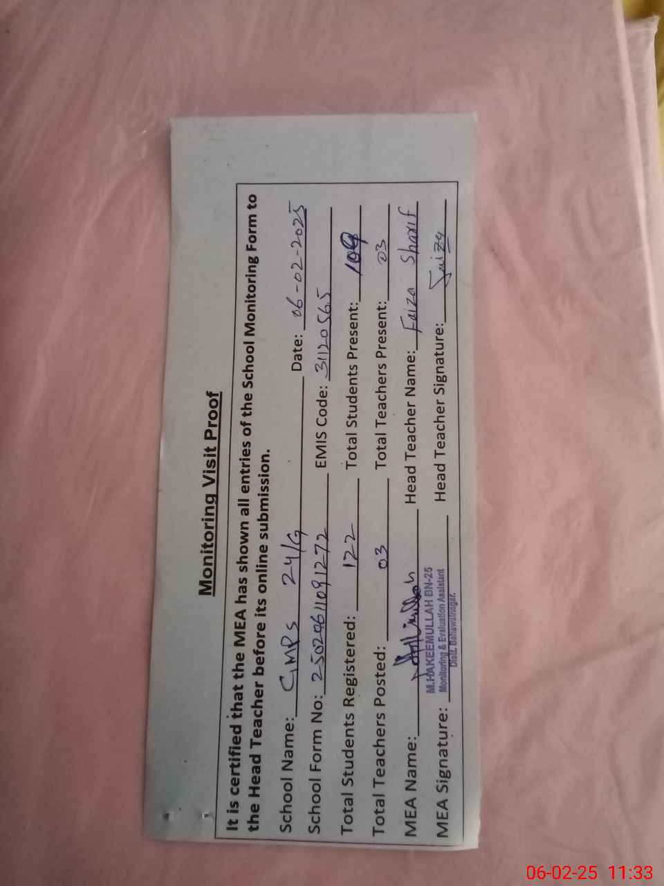 | Attendance Register | Head Teacher | MEA with School | Visit Proof |