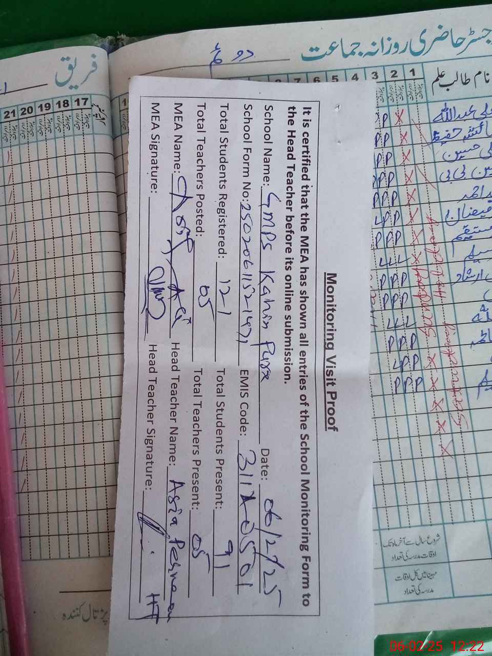 | Attendance Register | Head Teacher | MEA with School | Visit Proof |