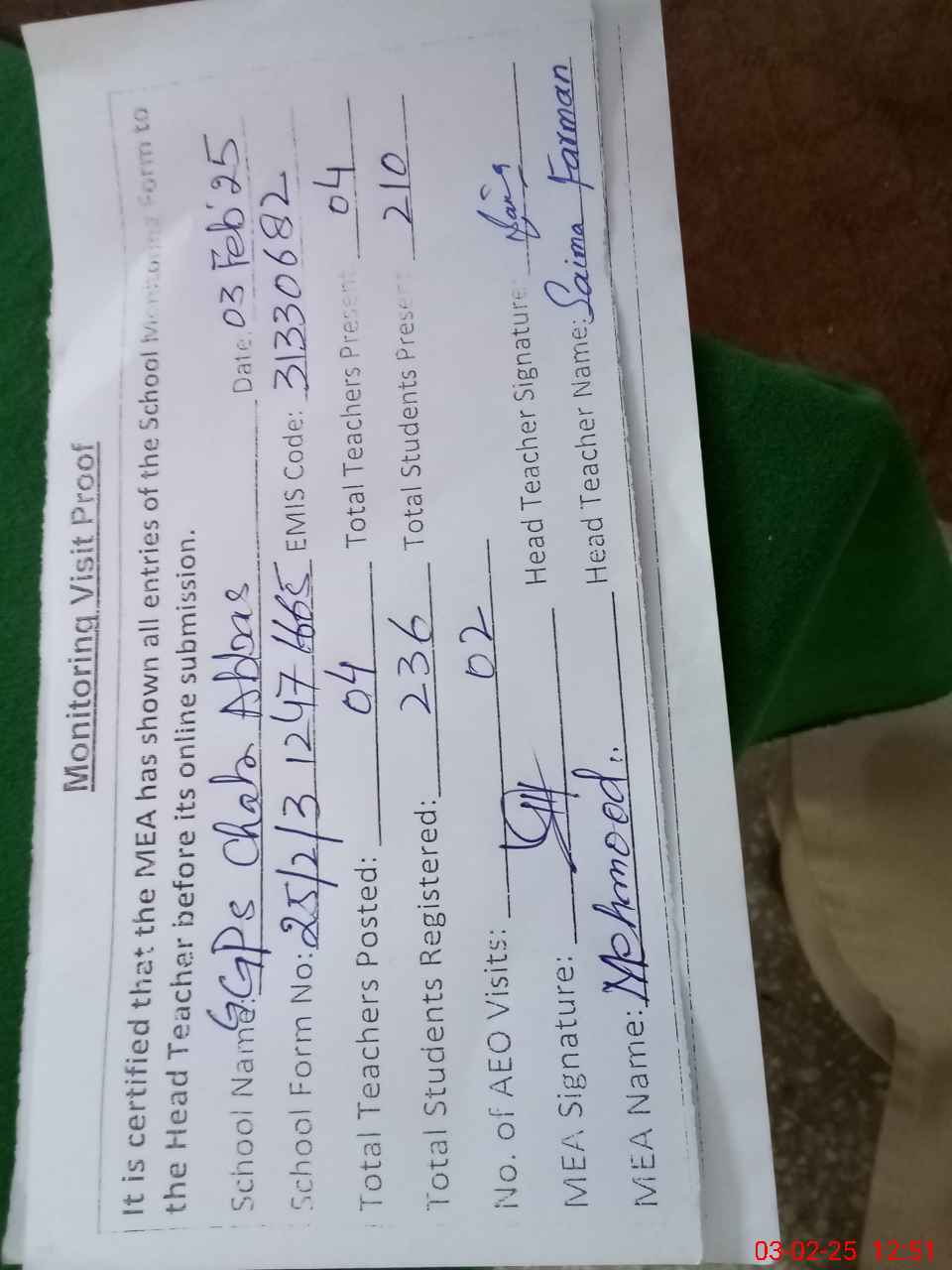 | Monitoring Date: 03-02-2025 | Start Time: 03-02-2025 11:58 AM | End Time: 03-02-2025 12:51 PM | Name of MEA: Ma**** UlHa**** | |