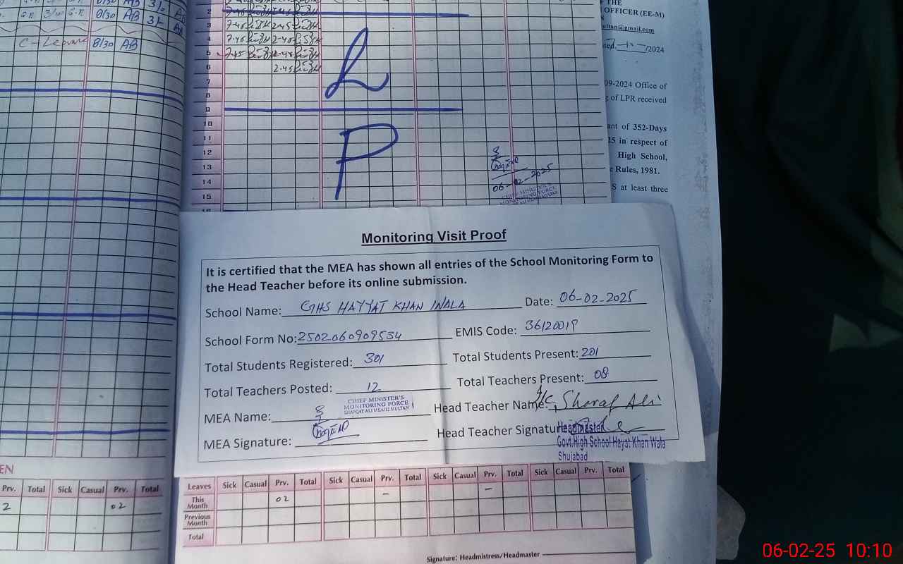 | EMIS Code: 36120019 | Name of School: GHS HAYAT KHAN WALA SHUJABAD | |||
