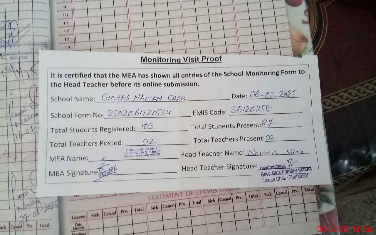 | Attendance Register | Head Teacher | MEA with School | Visit Proof |