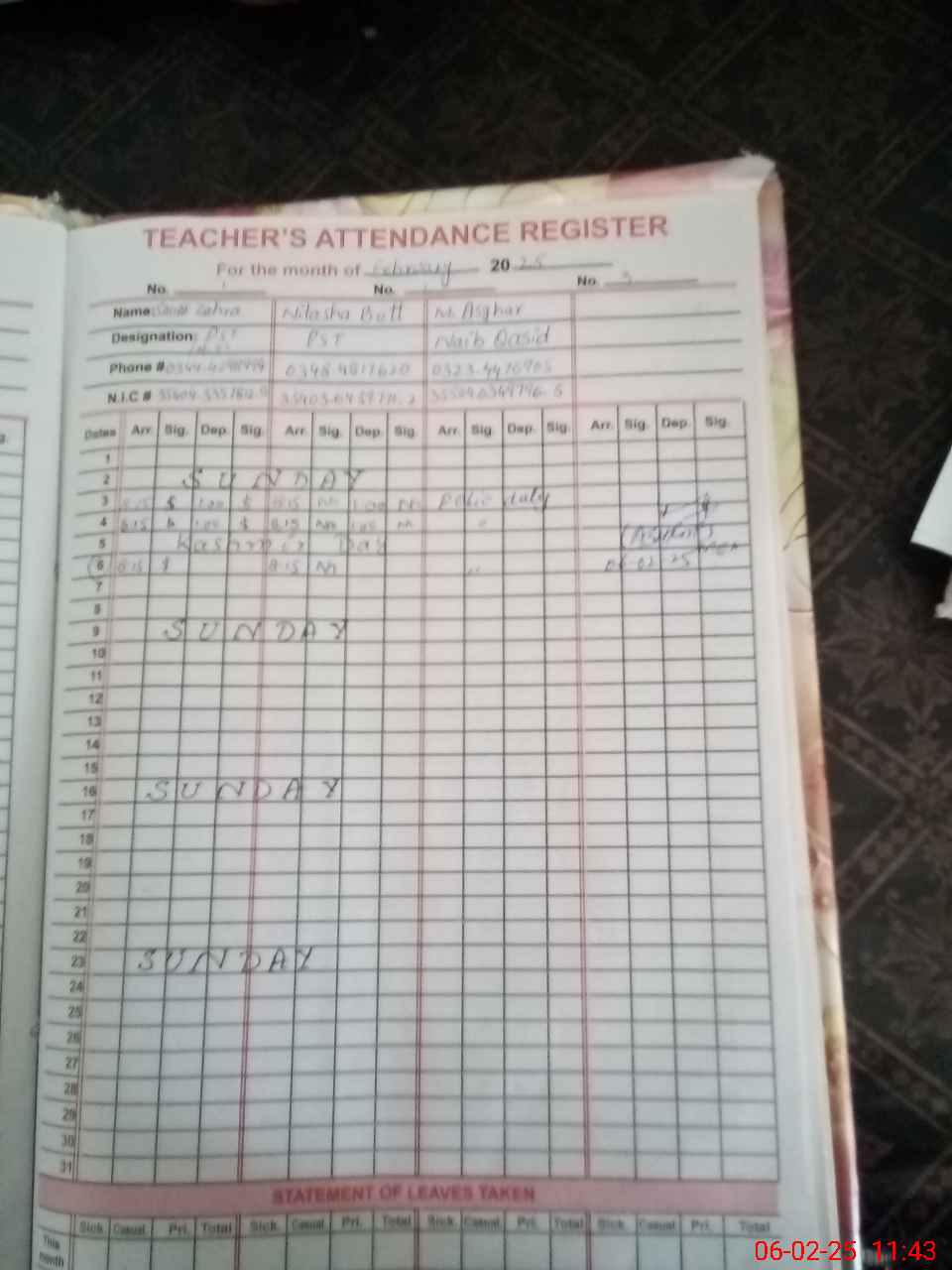 | CNIC | Full Name | Designation | R/C | Absence During Last Calender Month |