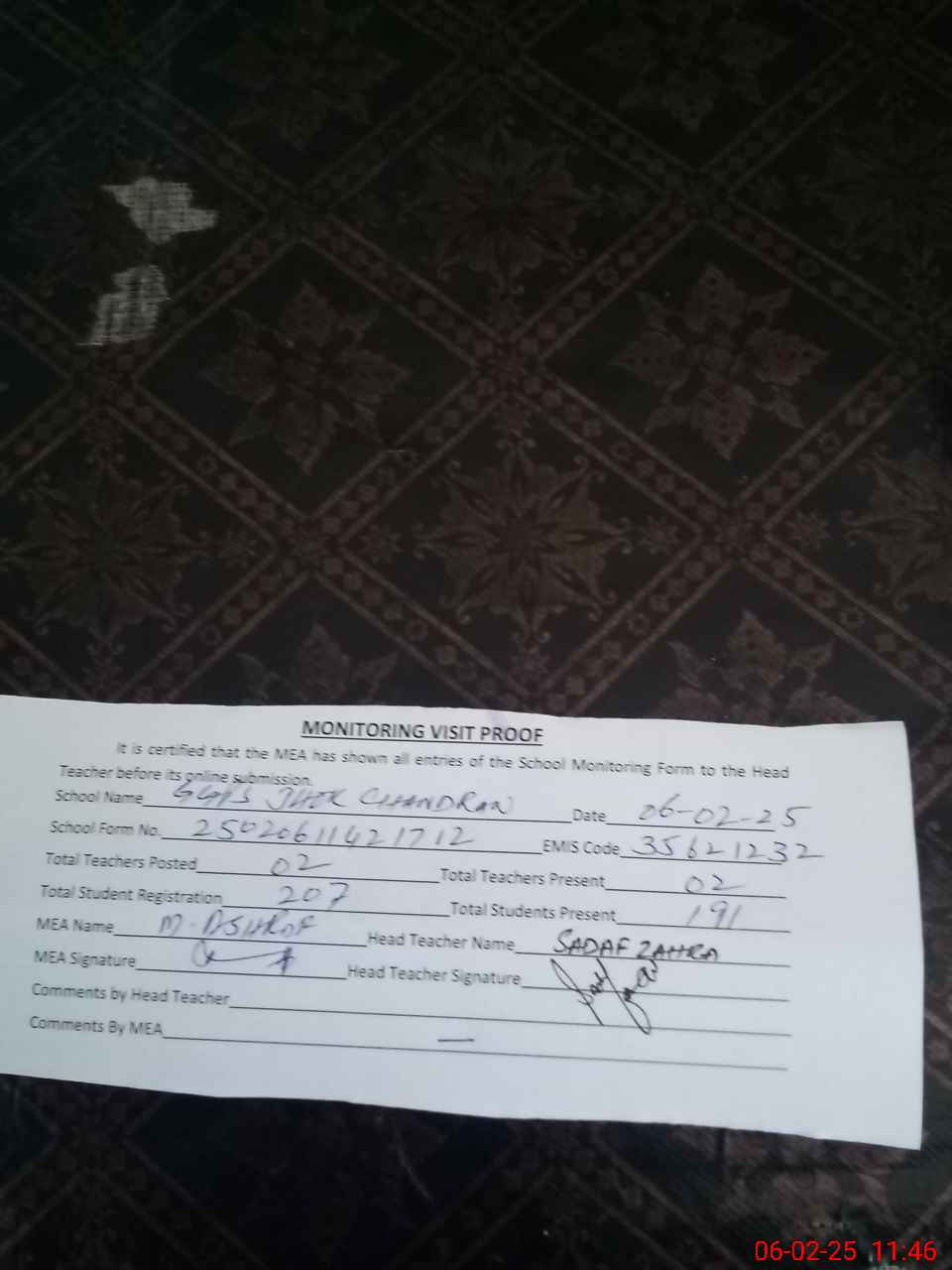 | Attendance Register | Head Teacher | MEA with School | Visit Proof |