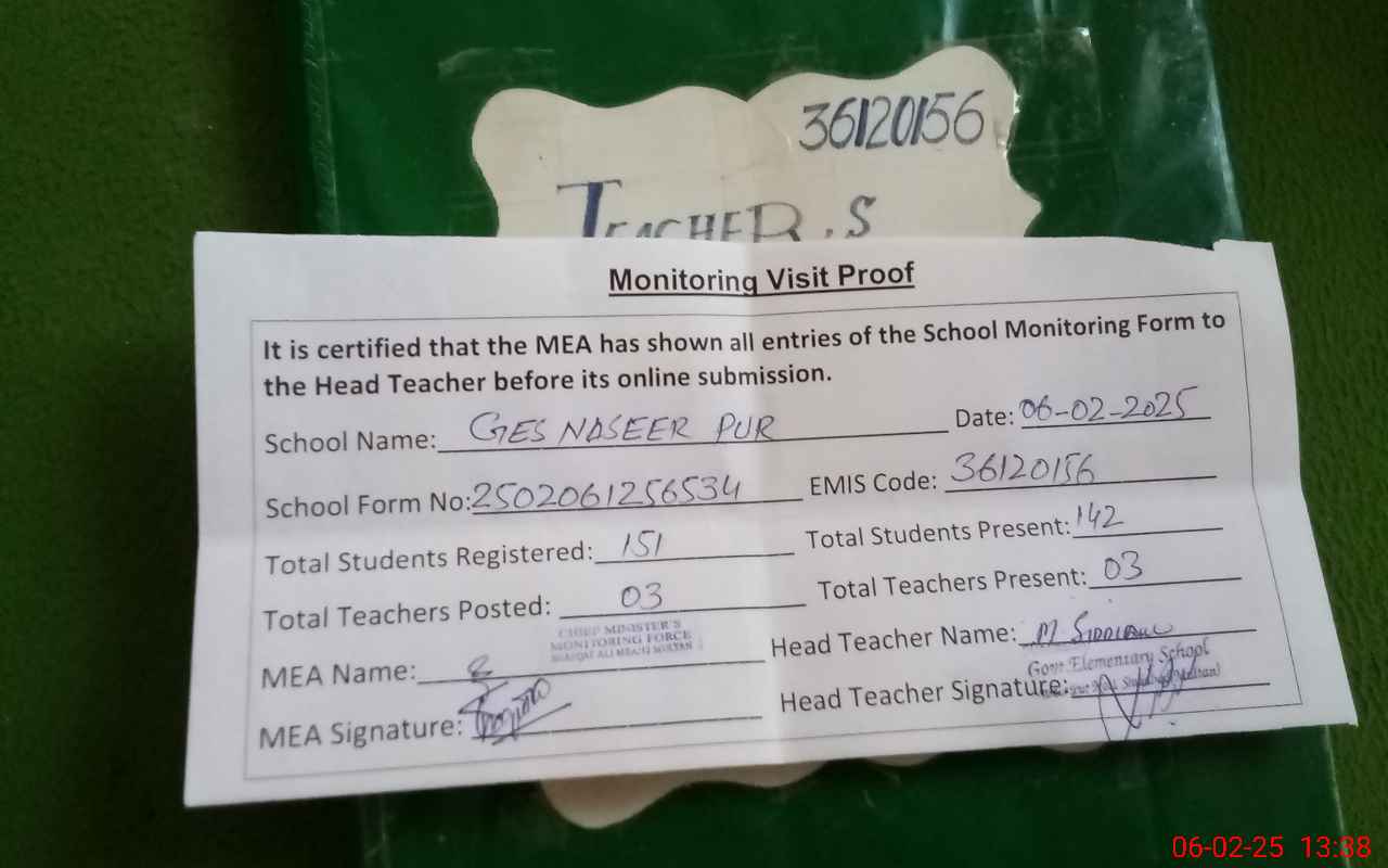 | EMIS Code: 36120156 | Name of School: GES NASEER PUR NO.1 SHUJABAD | |||