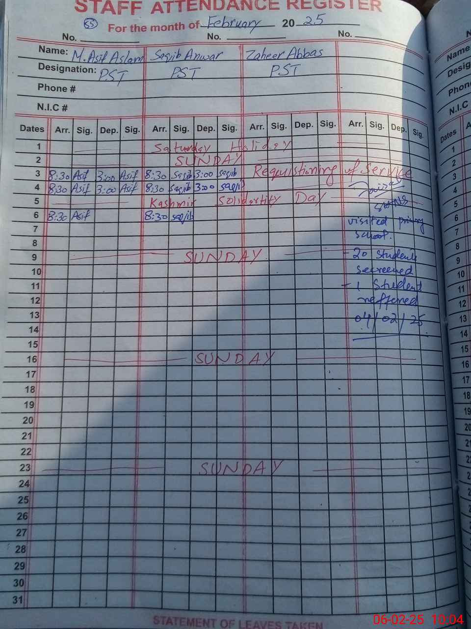 | CNIC | Full Name | Designation | R/C | Absence During Last Calender Month |