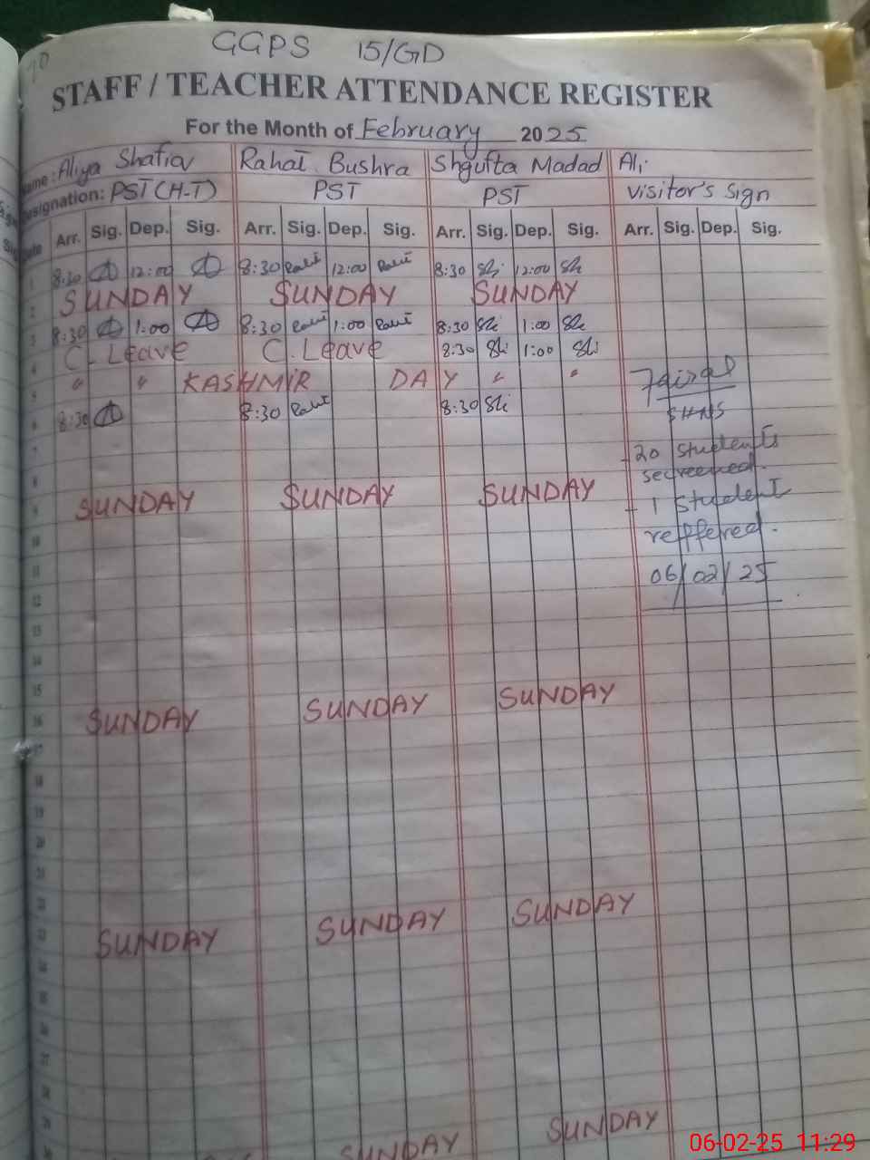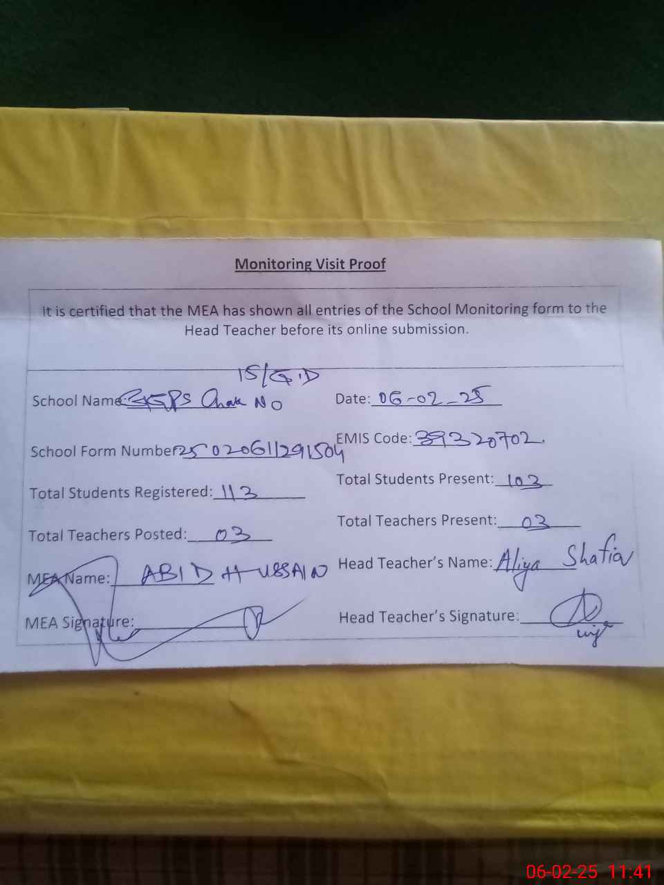 | Attendance Register | Head Teacher | MEA with School | Visit Proof |
