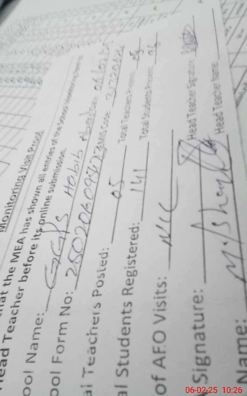 | Attendance Register | Head Teacher | MEA with School | Visit Proof |