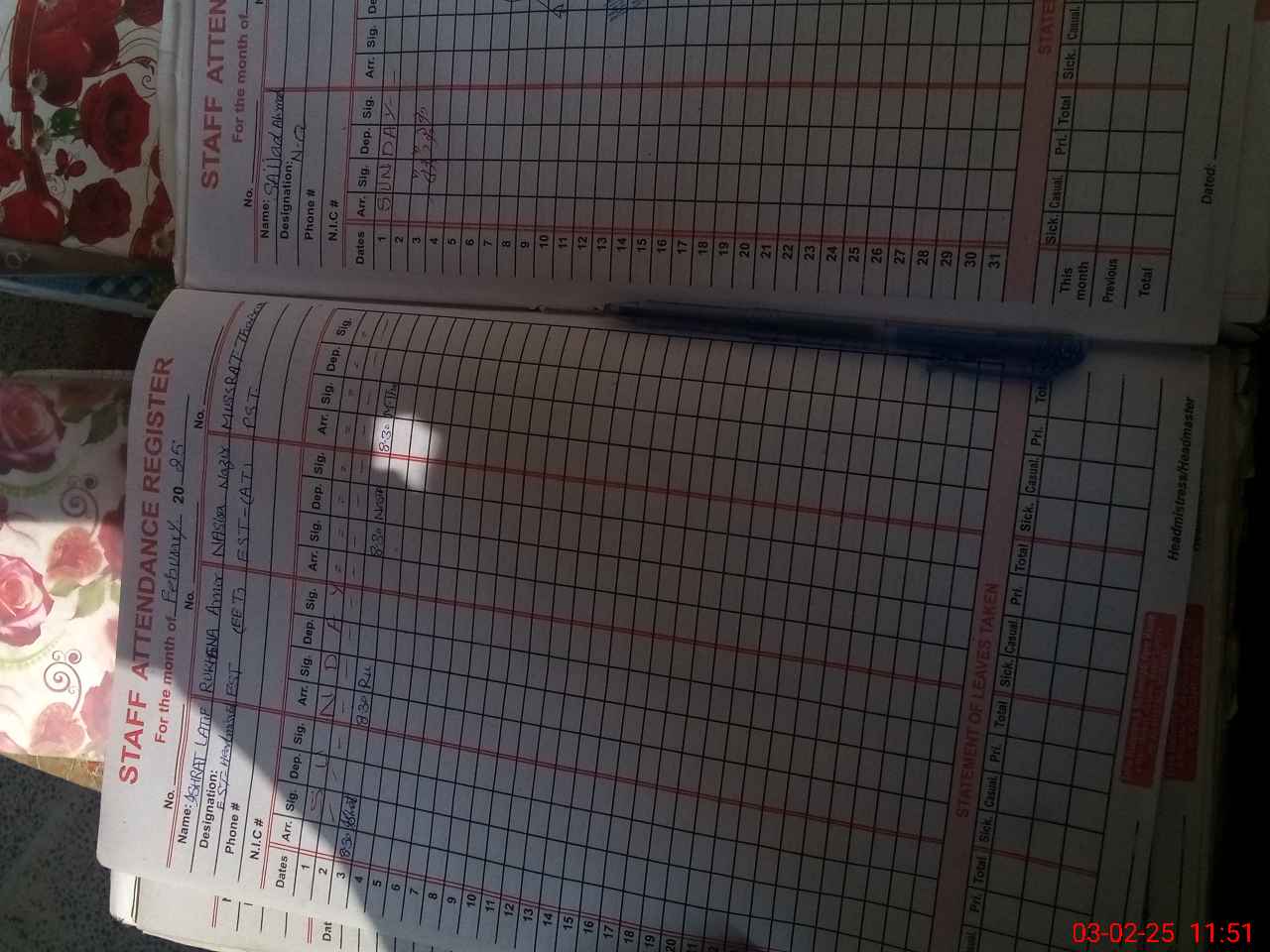 | CNIC | Full Name | Designation | R/C | Absence During Last Calender Month |