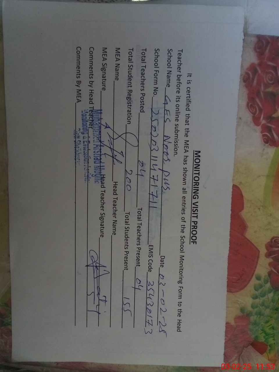 | Attendance Register | Head Teacher | MEA with School | Visit Proof |