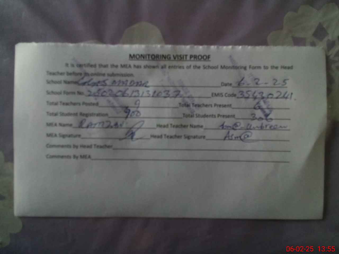 | Attendance Register | Head Teacher | MEA with School | Visit Proof |