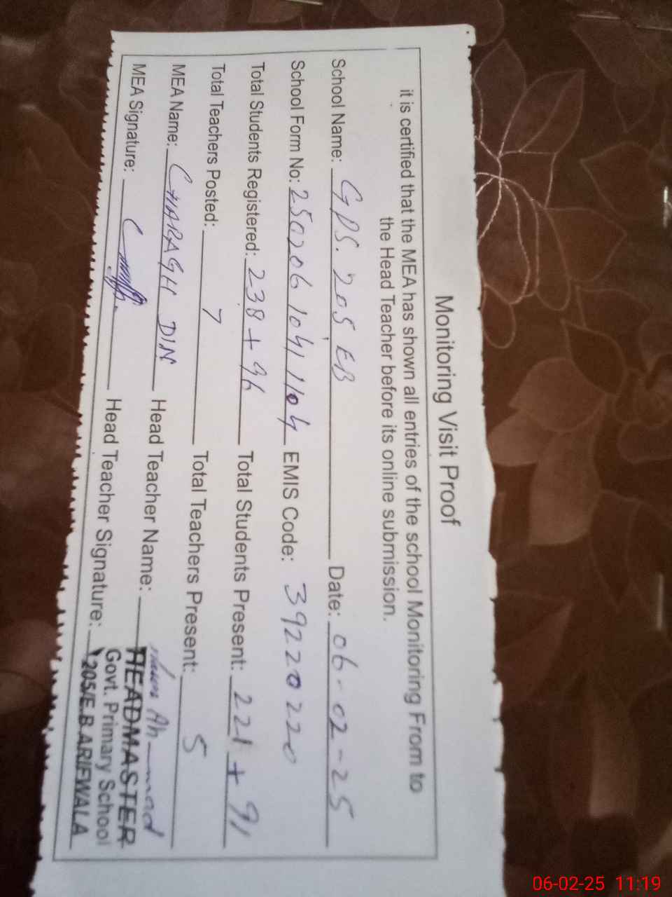 | Certified that this School was Inspected by the Undersigned MEA/DMO Today and the Information Stated Above is as Per Record. | |||||