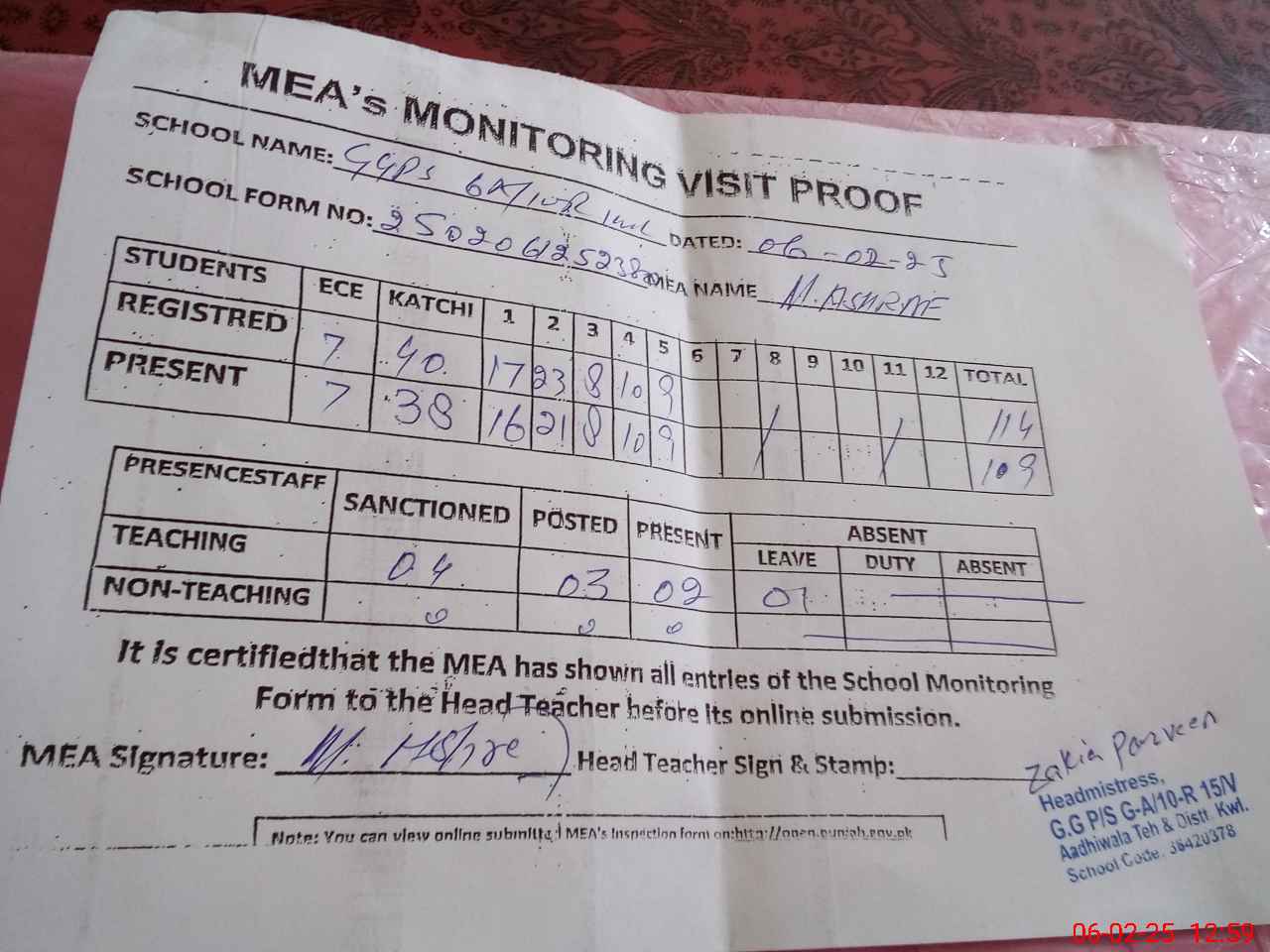 | Attendance Register | Head Teacher | MEA with School | Visit Proof |