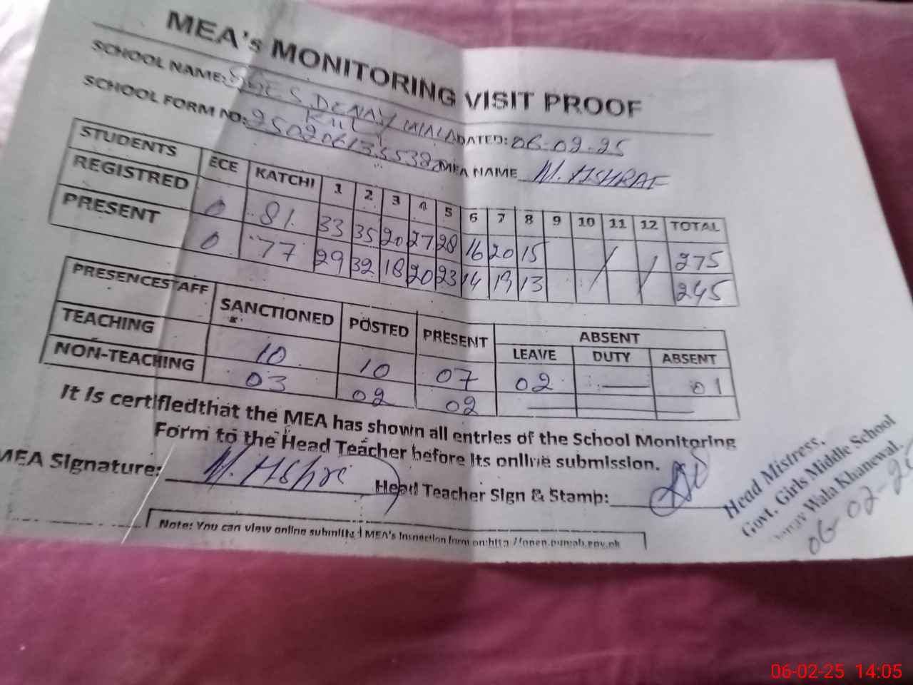 | Remarks (Use Separate Page if Required): Note miss ishrat nazeer PST ABSENT WEF 02 December 2024 to till date of school visit She applied maternity leave but not approve still | |||||