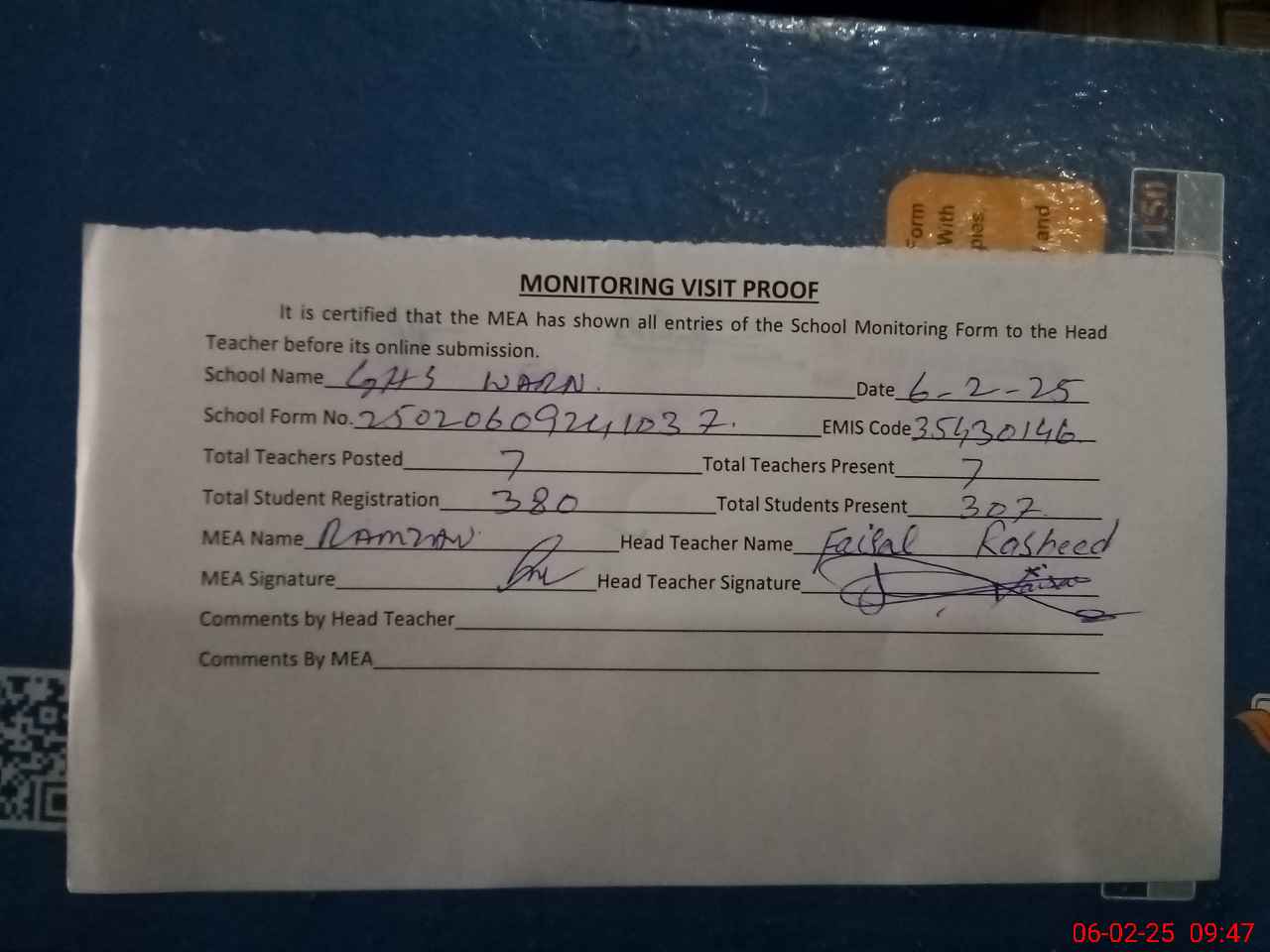 | Attendance Register | Head Teacher | MEA with School | Visit Proof |