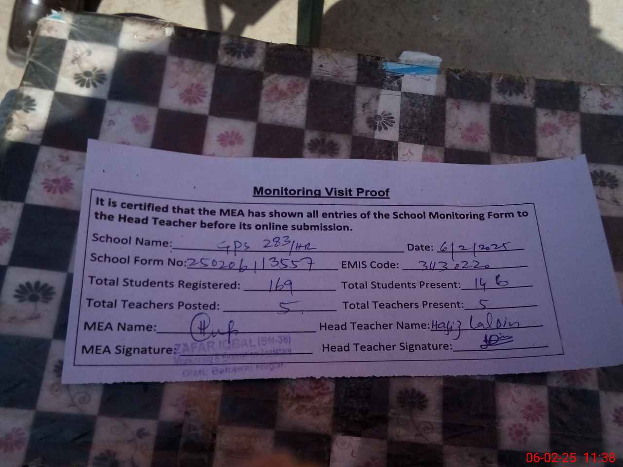 | Attendance Register | Head Teacher | MEA with School | Visit Proof |