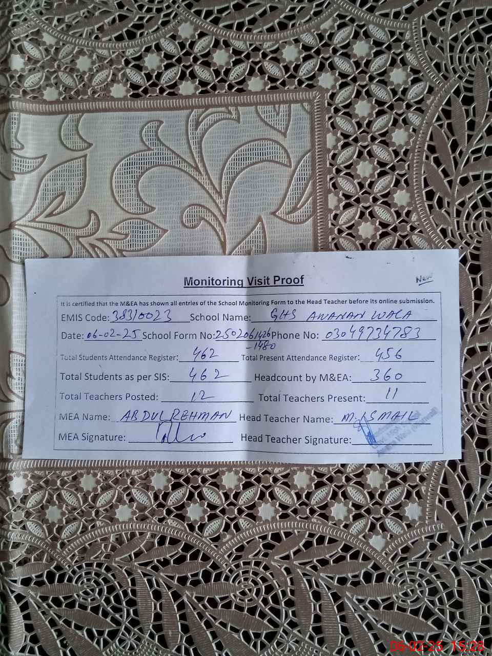| Attendance Register | Head Teacher | MEA with School | Visit Proof |