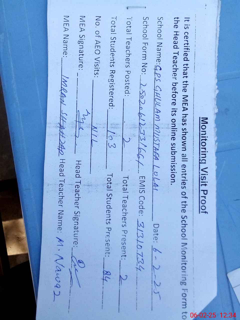| Attendance Register | Head Teacher | MEA with School | Visit Proof |