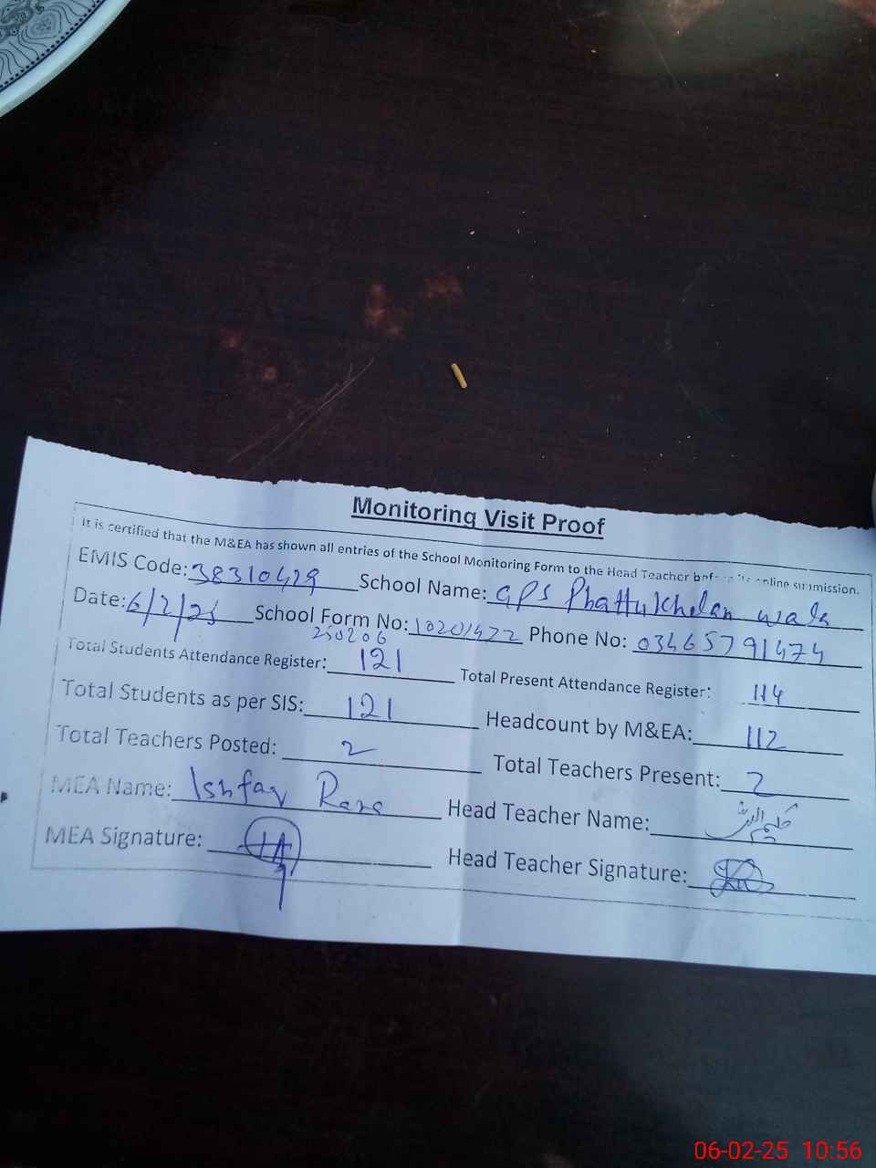 | Attendance Register | Head Teacher | MEA with School | Visit Proof |