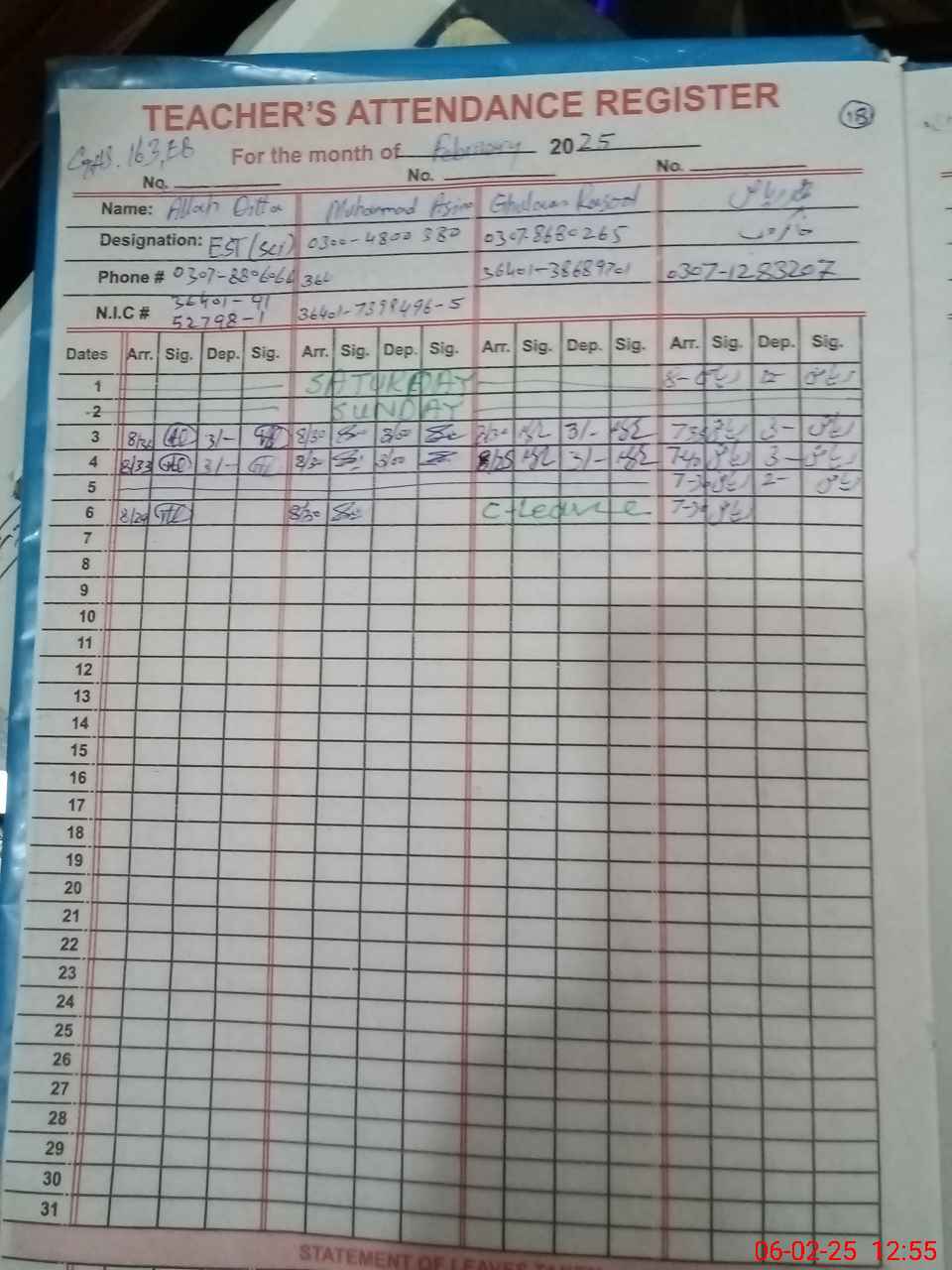| CNIC | Full Name | Designation | R/C | Absence during last cal. month |