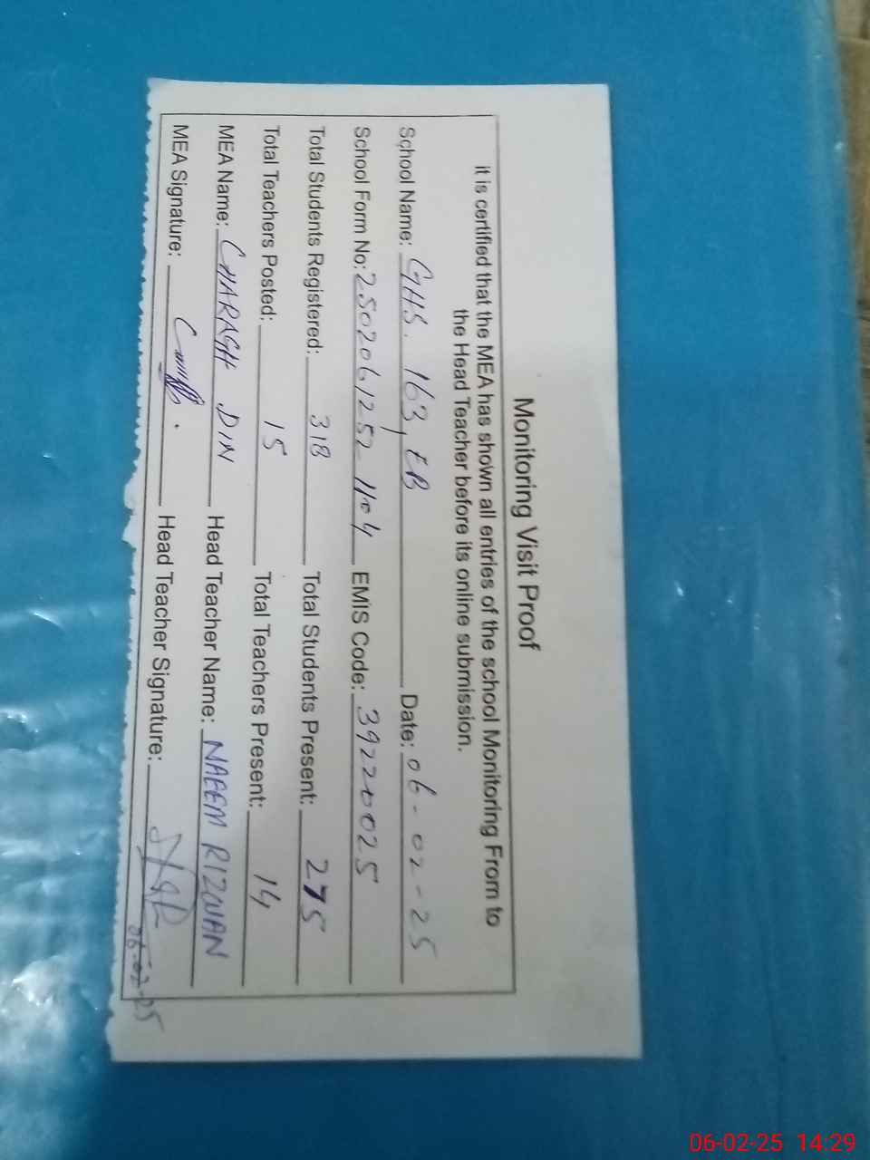 | Attendance Register | Head Teacher | MEA with School | Visit Proof |