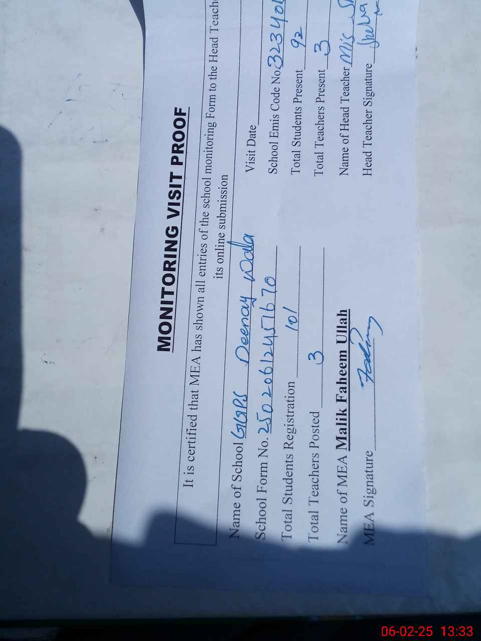 | Attendance Register | Head Teacher | MEA with School | Visit Proof |