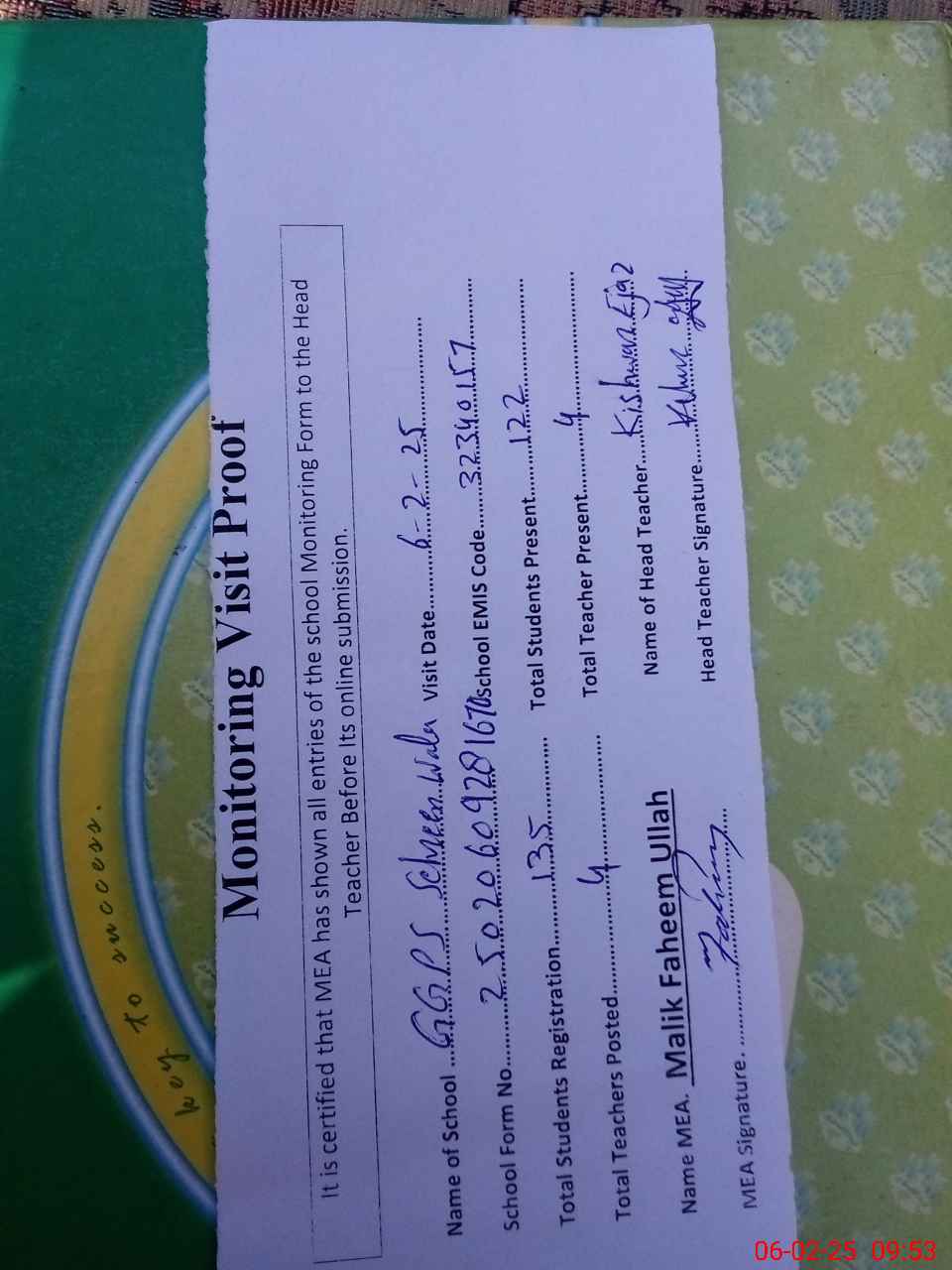 | Attendance Register | Head Teacher | MEA with School | Visit Proof |