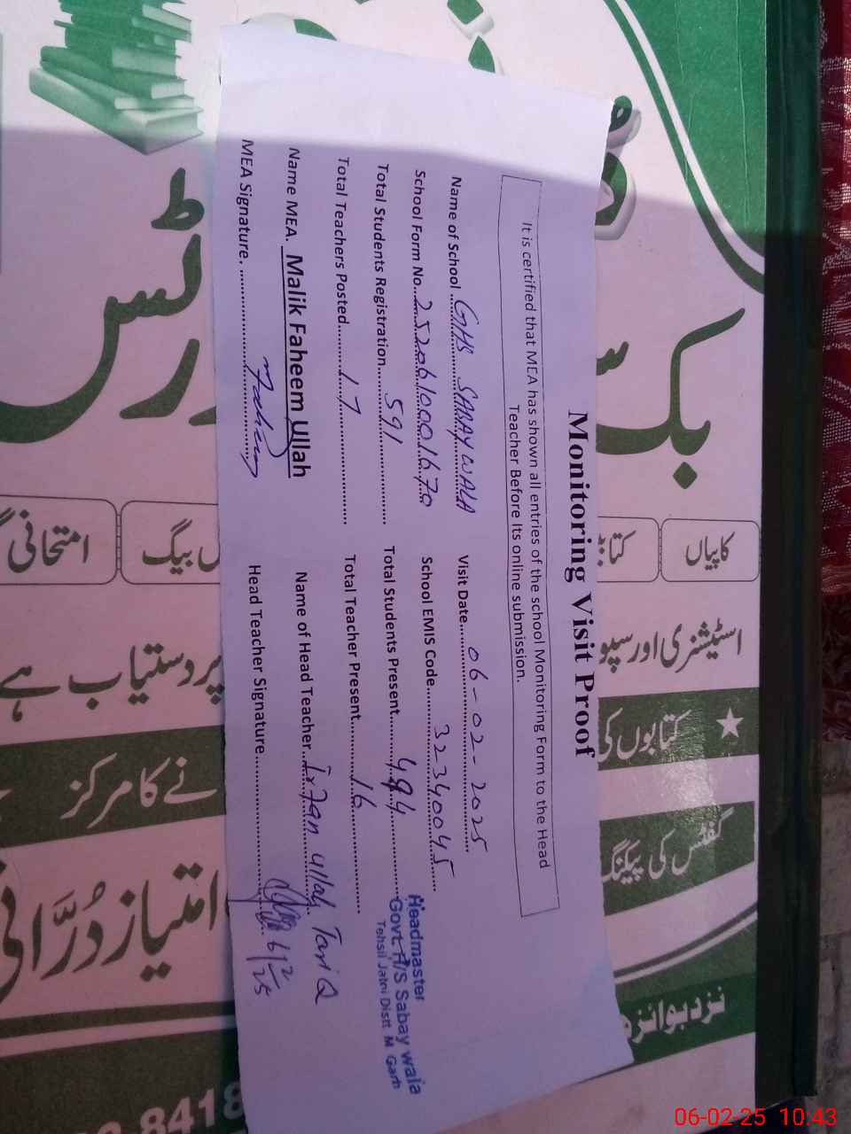 | EMIS Code: 32340045 | Name of School: GHS SABAY WALA | |||