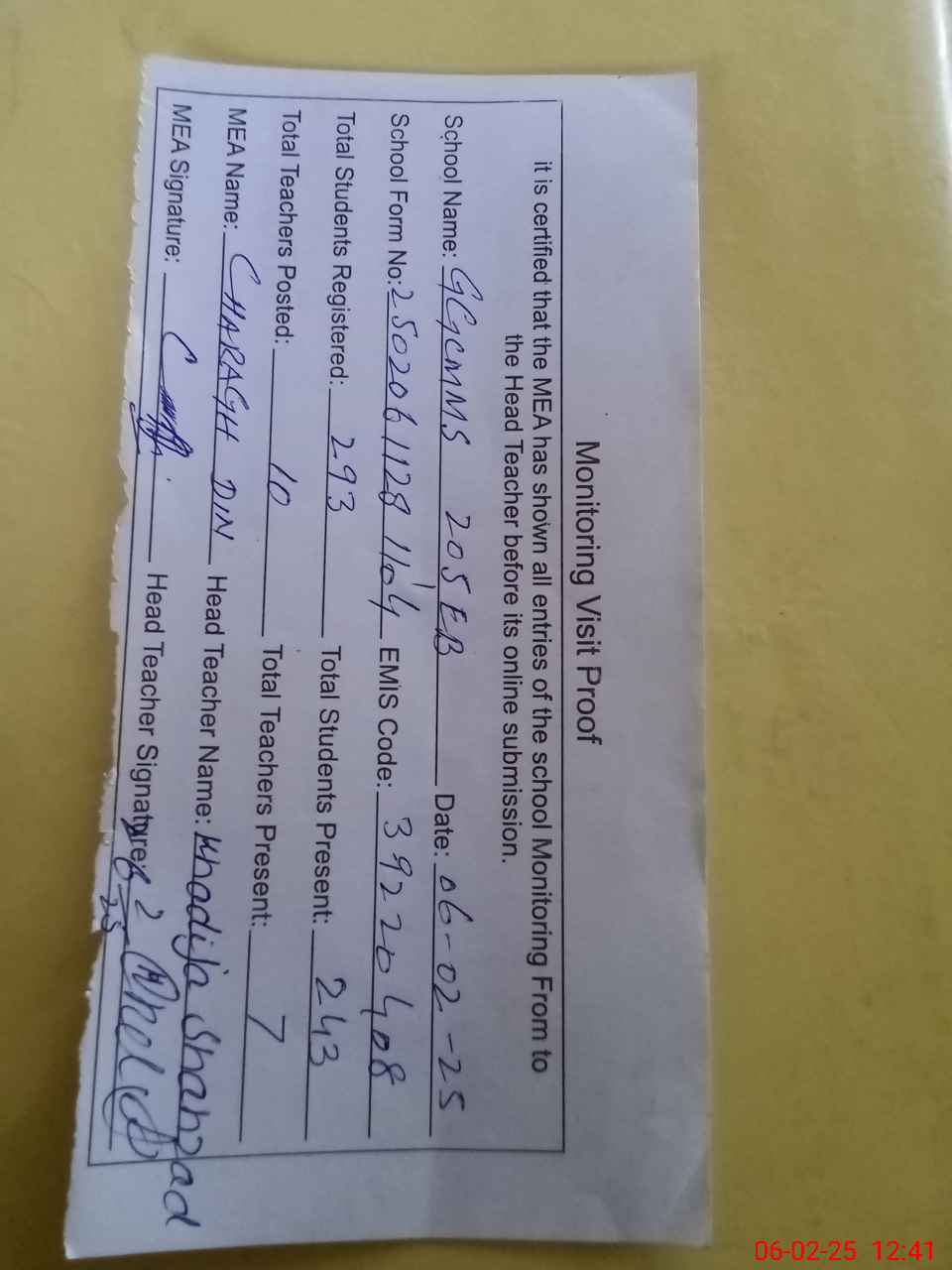 | Attendance Register | Head Teacher | MEA with School | Visit Proof |
