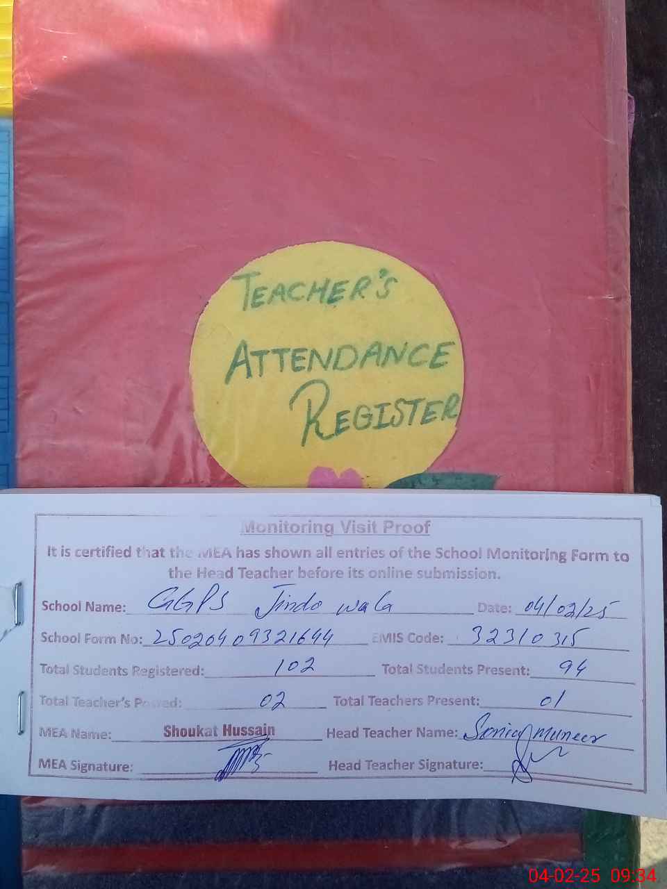 | Attendance Register | Head Teacher | MEA with School | Visit Proof |