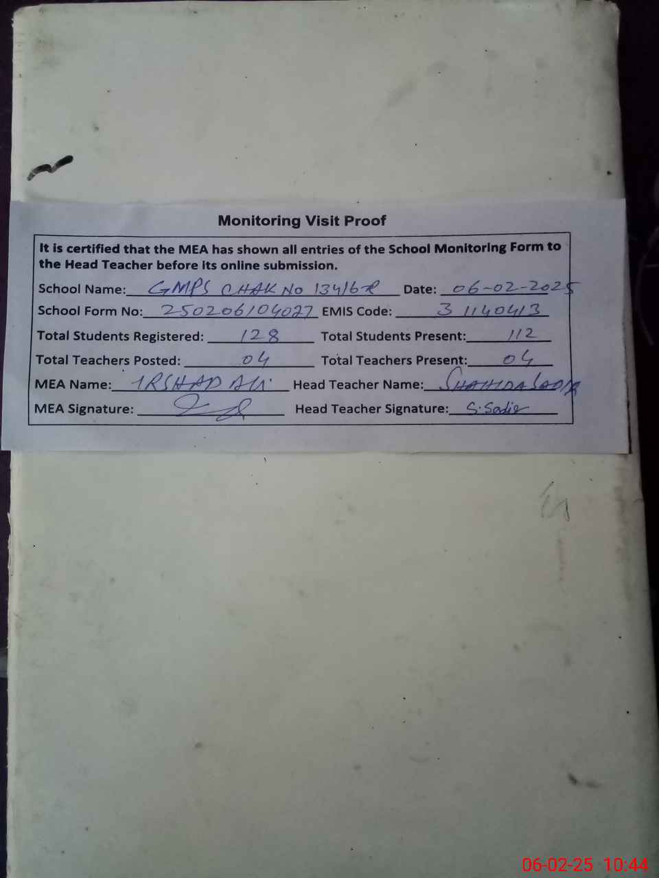 | Attendance Register | Head Teacher | MEA with School | Visit Proof |