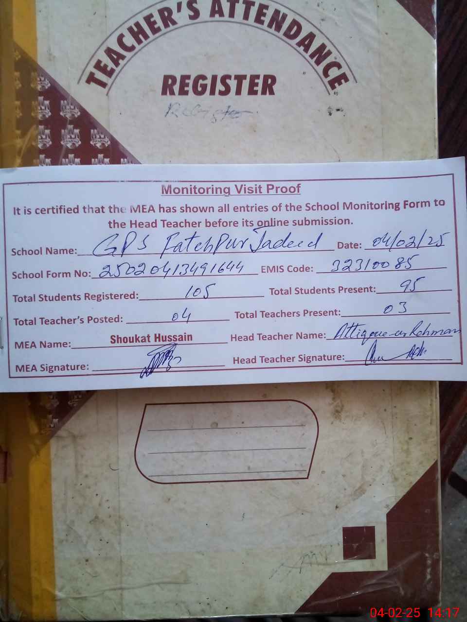 | Attendance Register | Head Teacher | MEA with School | Visit Proof |