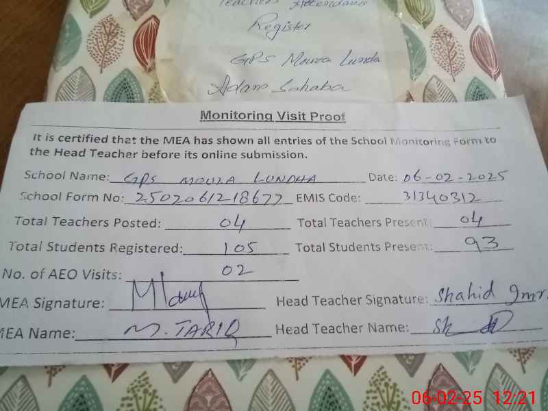 | Attendance Register | Head Teacher | MEA with School | Visit Proof |