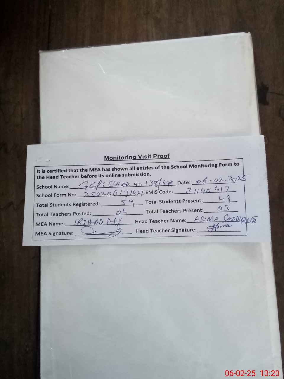 | EMIS Code: 31140417 | Name of School: GGPS CHAK NO 138/6-R | |||