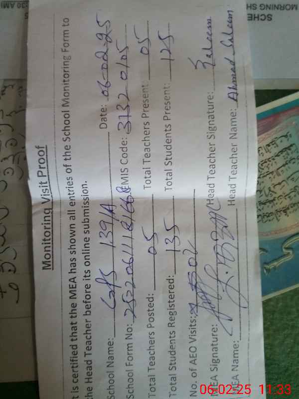 | Attendance Register | Head Teacher | MEA with School | Visit Proof |