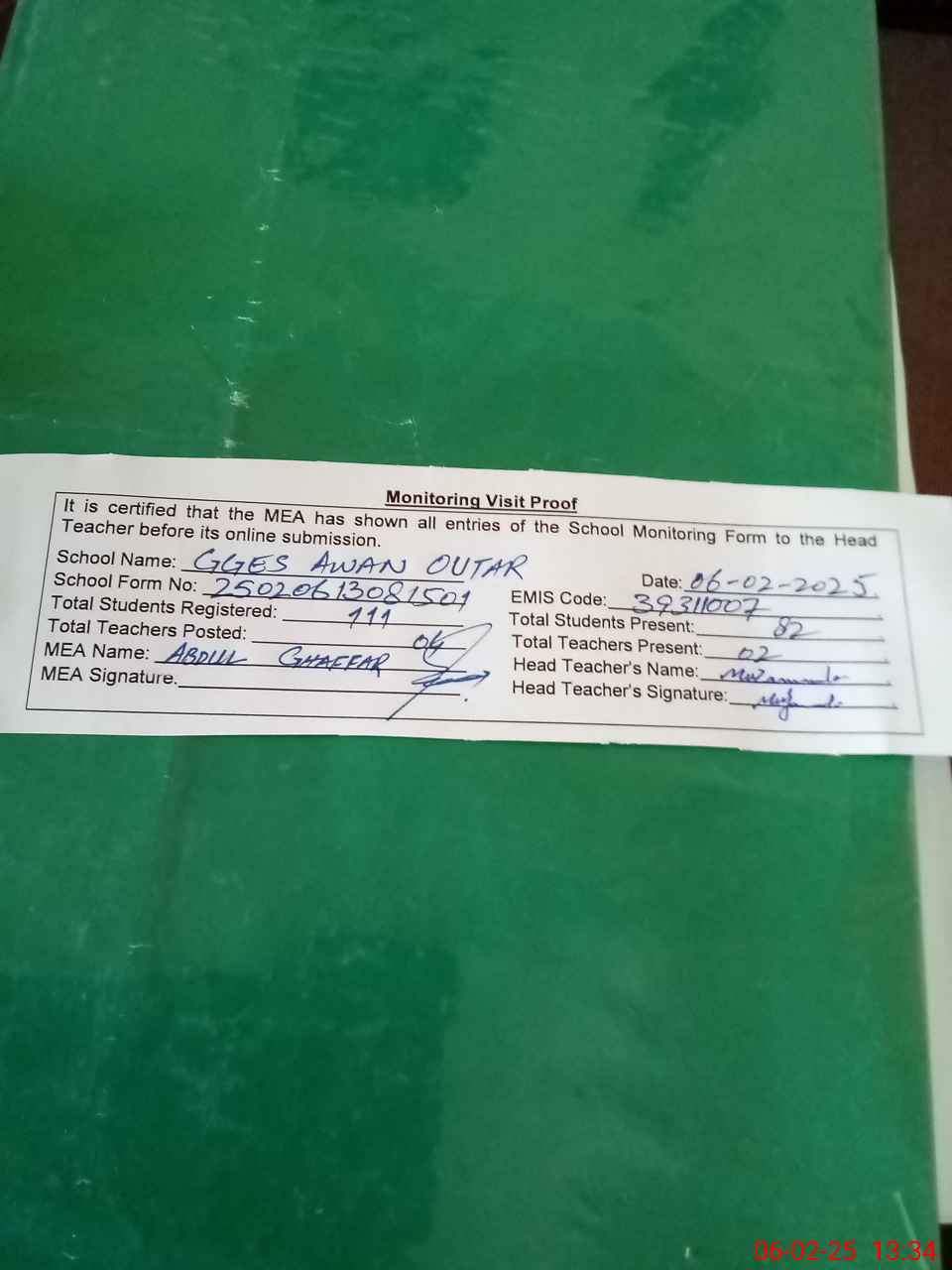 | Attendance Register | Head Teacher | MEA with School | Visit Proof |