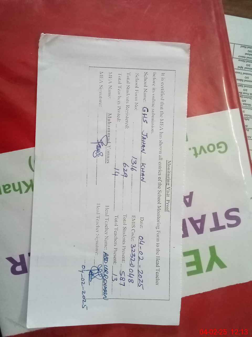 | Attendance Register | Head Teacher | MEA with School | Visit Proof |